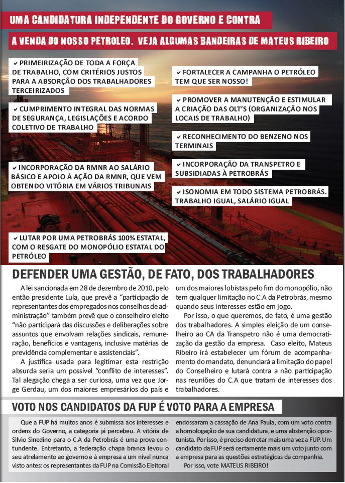 "Não podemos deixar que aconteça o que a empresa quer, que é impedir que haja no C.A. uma representação da categoria, que lute em defesa dos petroleiros. Por isso eu me inscrevi com o apoio de minha base e quero que todos intensifiquem a campanha pela minha reintegração e pela manutenção da minha candidatura. Gostaria que todos os candidatos fizessem campanha pelo fortalecimento da luta e contra a injustiça que foi minha demissão. Não podemos deixar que a categoria entregue essa vaga nas mãos da empresa, precisamos de alguém de luta para nos representar", concluiu Ana.